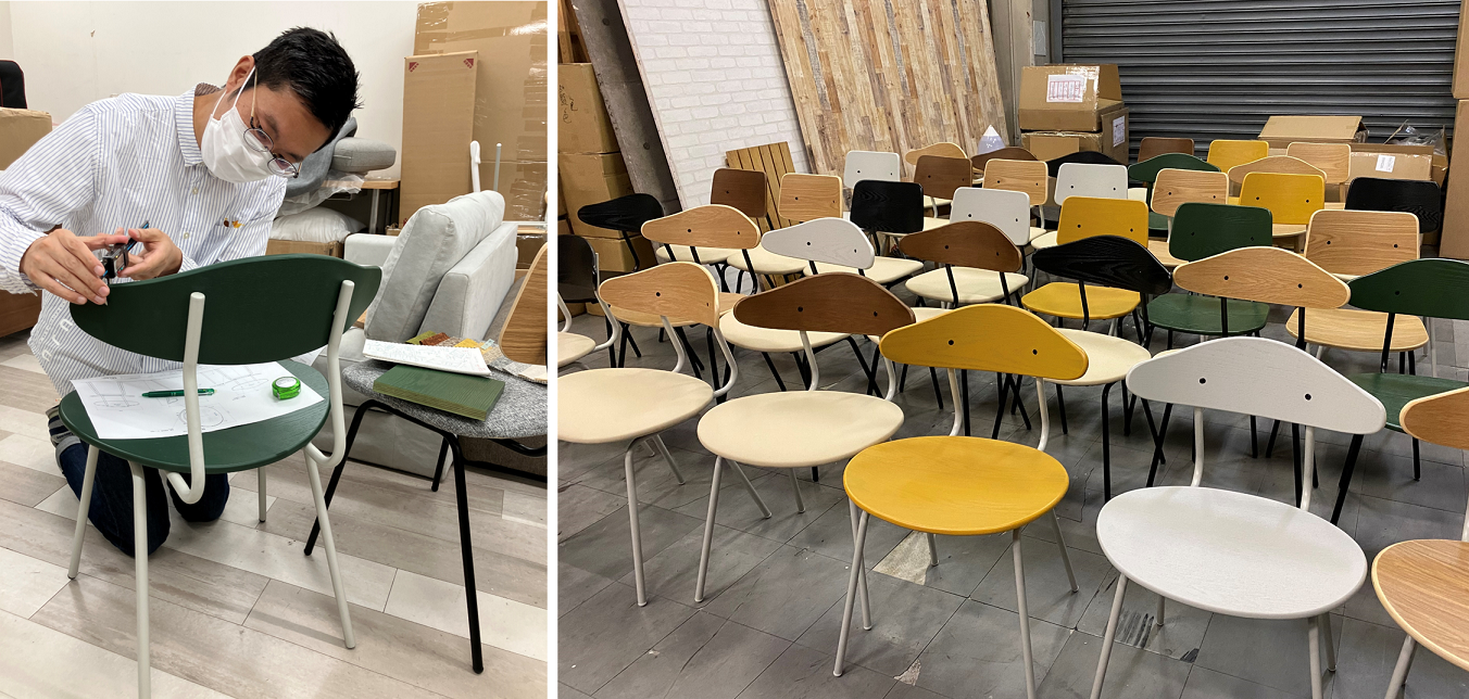 大変な部分と、やりがいを感じた部分と両方ありますね。鉄材についてはそれなりに知識がありましたが、木材が主体になる家具において、木材の知識はまだまだ勉強中でしたので、品質・強度を担保できる仕様を考えるのは大変でした。でも、新たな知識習得の良い機会と捉え、楽しく取り組めました。長く什器づくりを担当してきましたが、学生時代は建築を学び、住宅や店舗の内装デザイン・設計の経験をしていて、家具への興味はずっとありました。什器と家具は似ているとは言われますが、全然違う分野なので、知らないことを1から挑戦できるというのが楽しいですし、やりたいことを提案できたので、やりがいが上回りました。